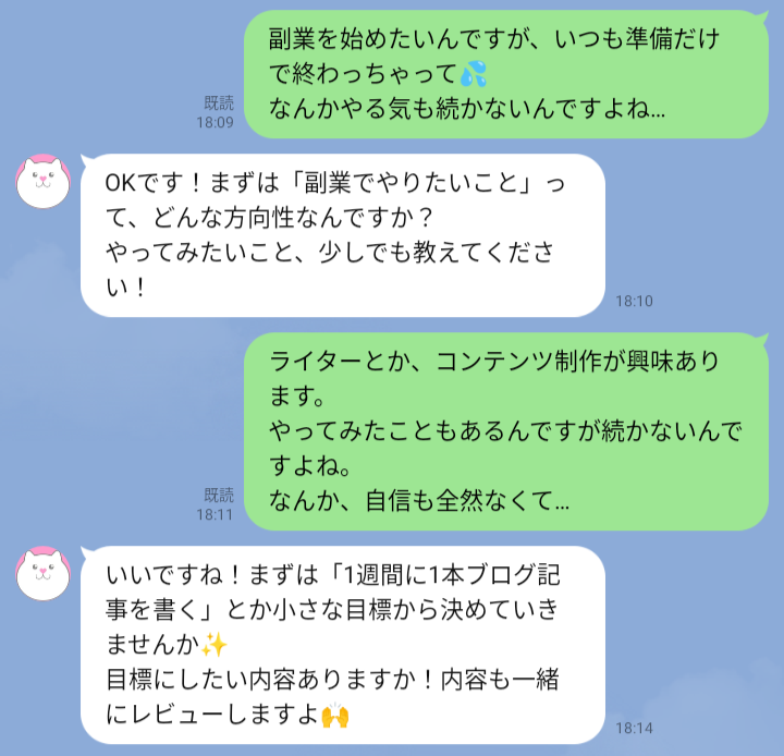自分ひとりでは続けられない目標やタスクも、チャットを通じて定期的に進捗を確認してもらうことで、行動を継続させやすくなります。