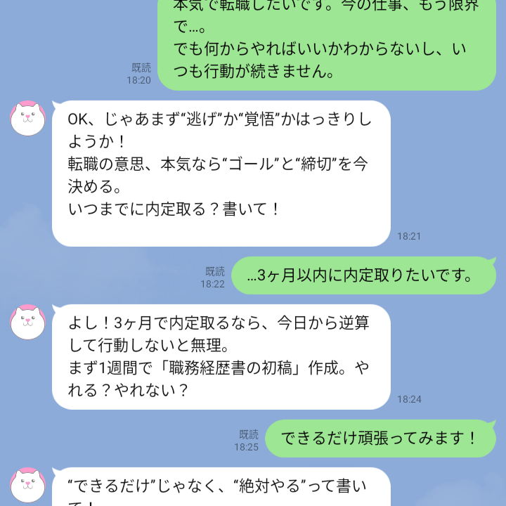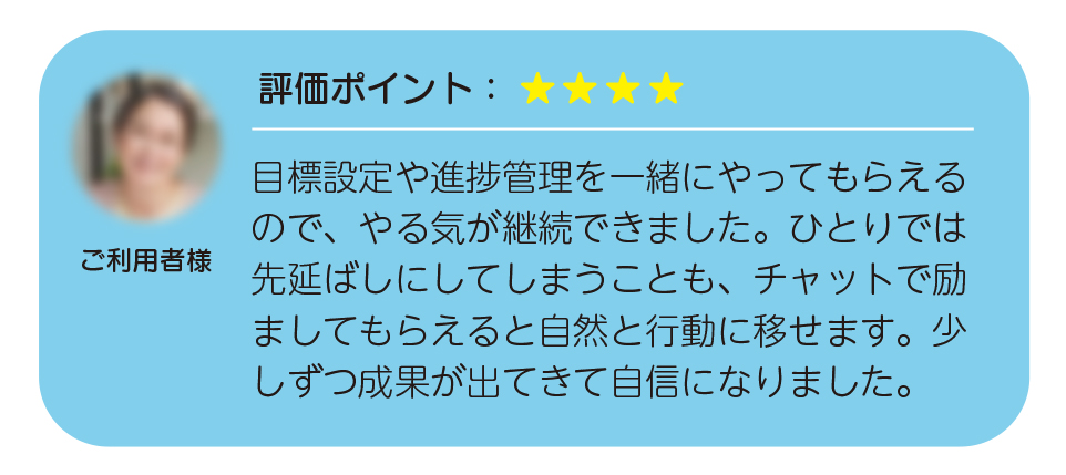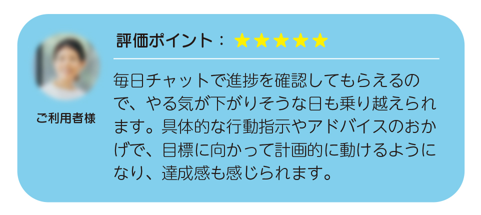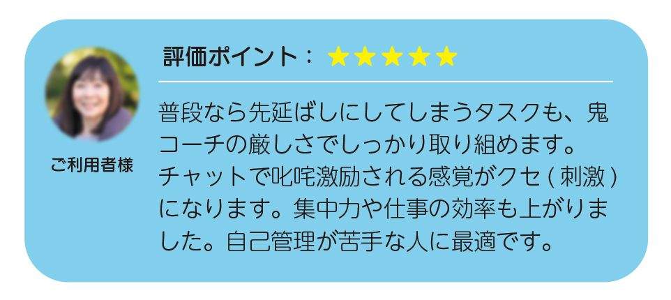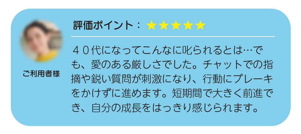 甘えや先延ばしが出やすい人に適しており、チャットでの厳しい指摘や鋭い質問によって、自分を追い込む感覚で行動にブレーキをかけずに取り組めます。