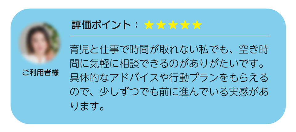 忙しい日常の合間でも、自分のペースで相談できるため、育児や仕事で時間が取りにくい人でも無理なく利用できます。