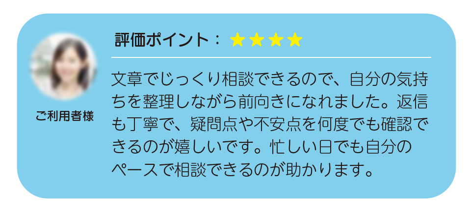 悩みや不安を詳細に伝えられ、プロのカウンセラーから丁寧な返信を受け取ることで、自分の気持ちや状況を客観的に整理し、前向きな行動につなげられます。