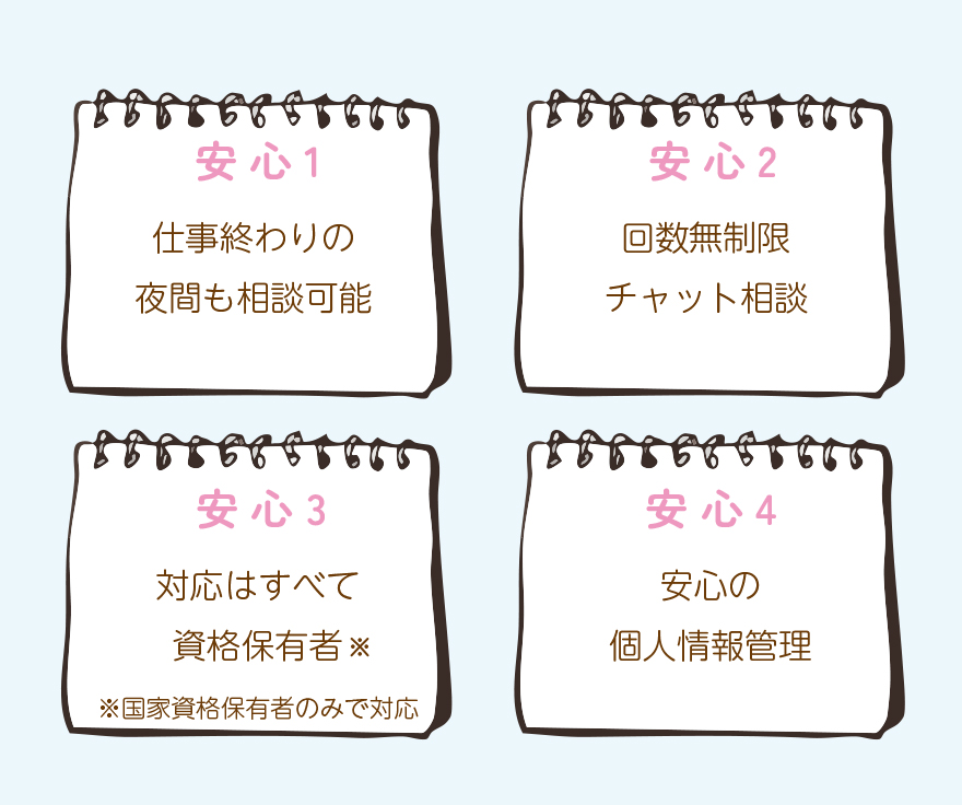 文字にすることで考えを落ち着いて整理できるので、対面では言いにくいことも安心して相談できます。